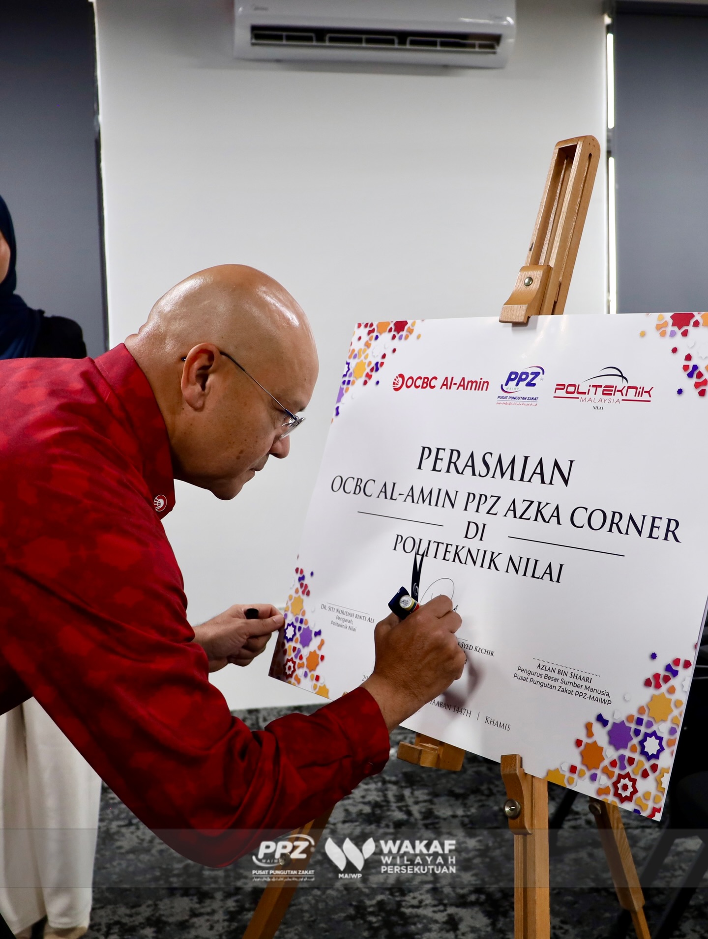 The launch ceremony was officiated through a plaque-signing session by the CEO of OCBC Al-Amin Bank Berhad, Tuan Syed Abdull Aziz Jailani Syed Kechik, and the Deputy Director of Academic Support at Politeknik Nilai, Encik Shuharzi Md Salleh, witnessed by representatives from PPZ-MAIWP.